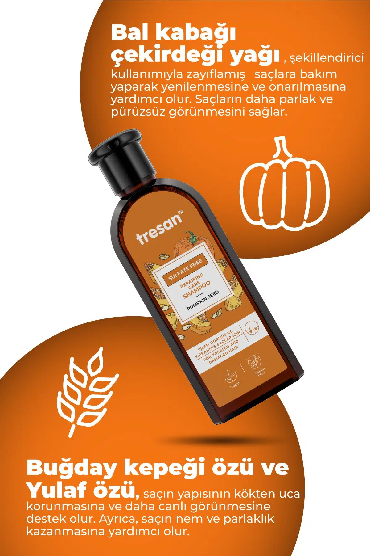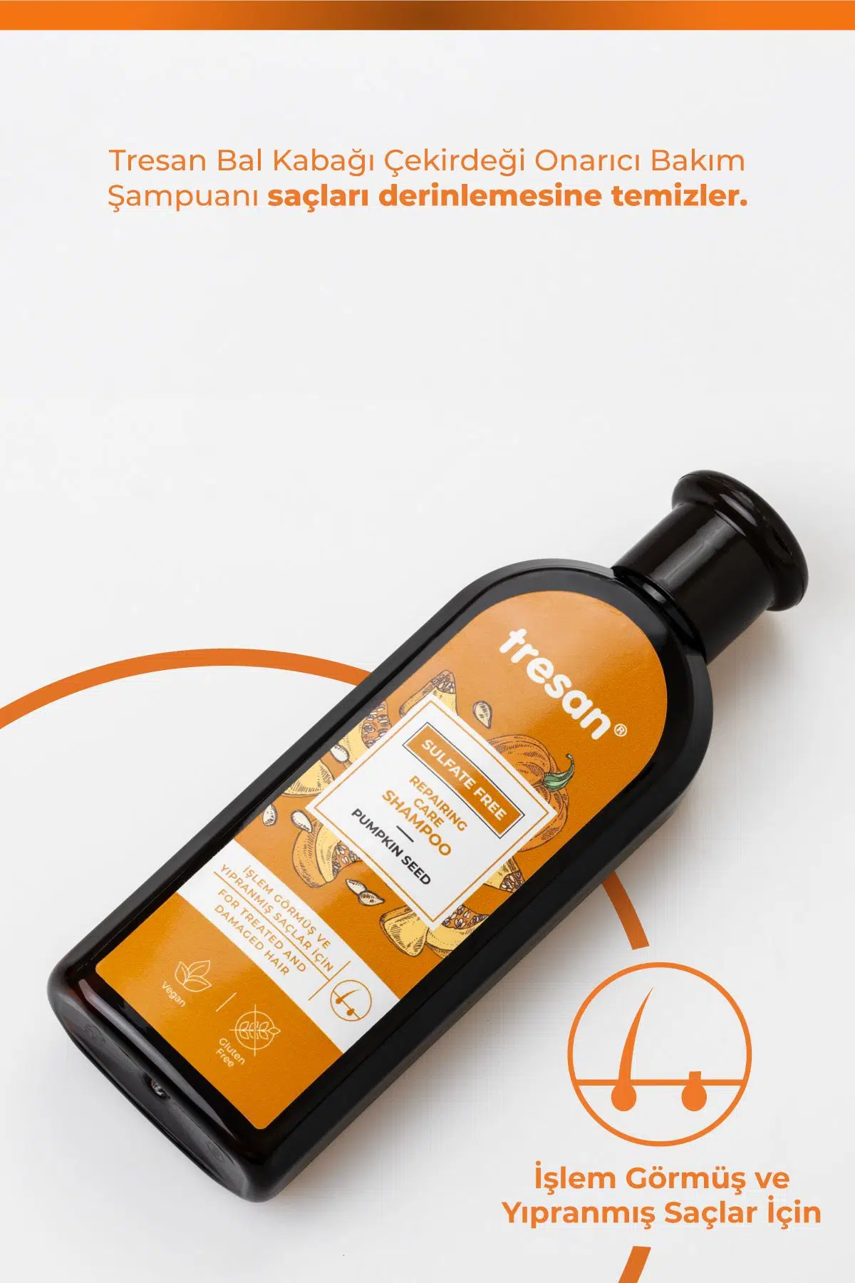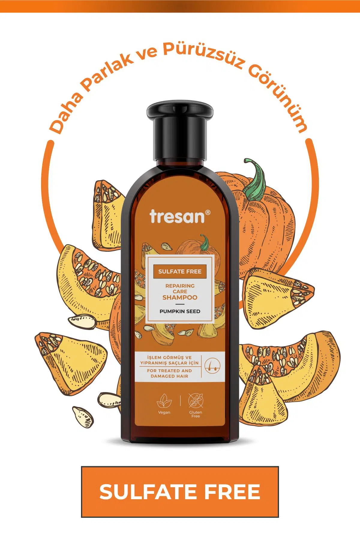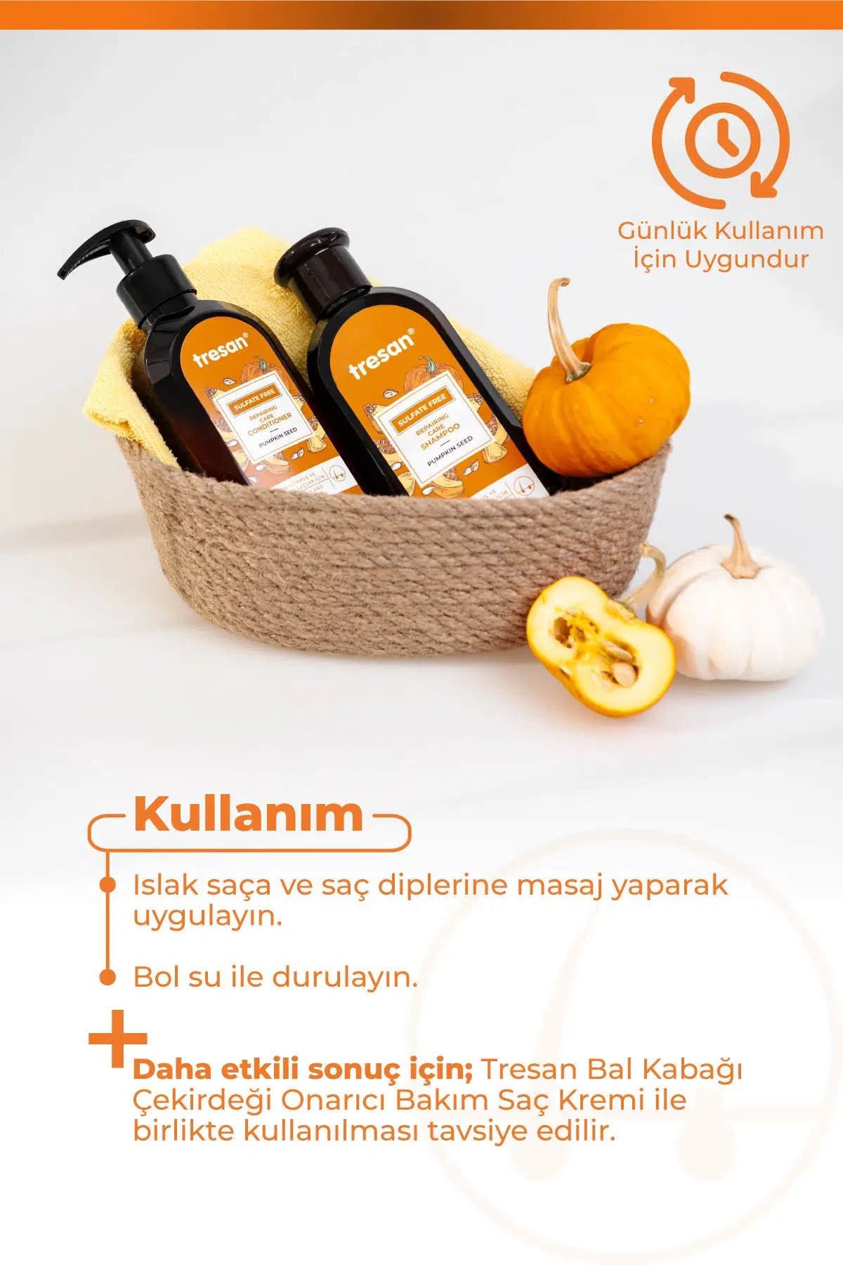 Tresan Bal Kabağı Çekirdeği Onarıcı Bakım Şampuanı, içeriğindeki Bal Kabağı çekirdeği yağı ile saçları derinlemesine temizler ve zayıflamış saçlara onarıcı bir dokunuş sağlar.; Saçların yenilenmesine ve daha parlak, pürüzsüz görünmelerine yardımcı olur.; Bal Kabağı çekirdeği yağına ek olarak, Buğday kepeği özü ve Yulaf özü saçın kökten uca korunmasına katkı sağlar, saçın nem ve parlaklık kazanmasına destek olur.; Kullanım: Islak saça ve saç diplerine masaj yaparak uygulayın.; Bol su ile durulayın.; Daha etkili sonuç için; Tresan Bal Kabağı Çekirdeği Onarıcı Bakım Saç Kremi ile birlikte kullanılması önerilir.; Günlük kullanıma uygundur