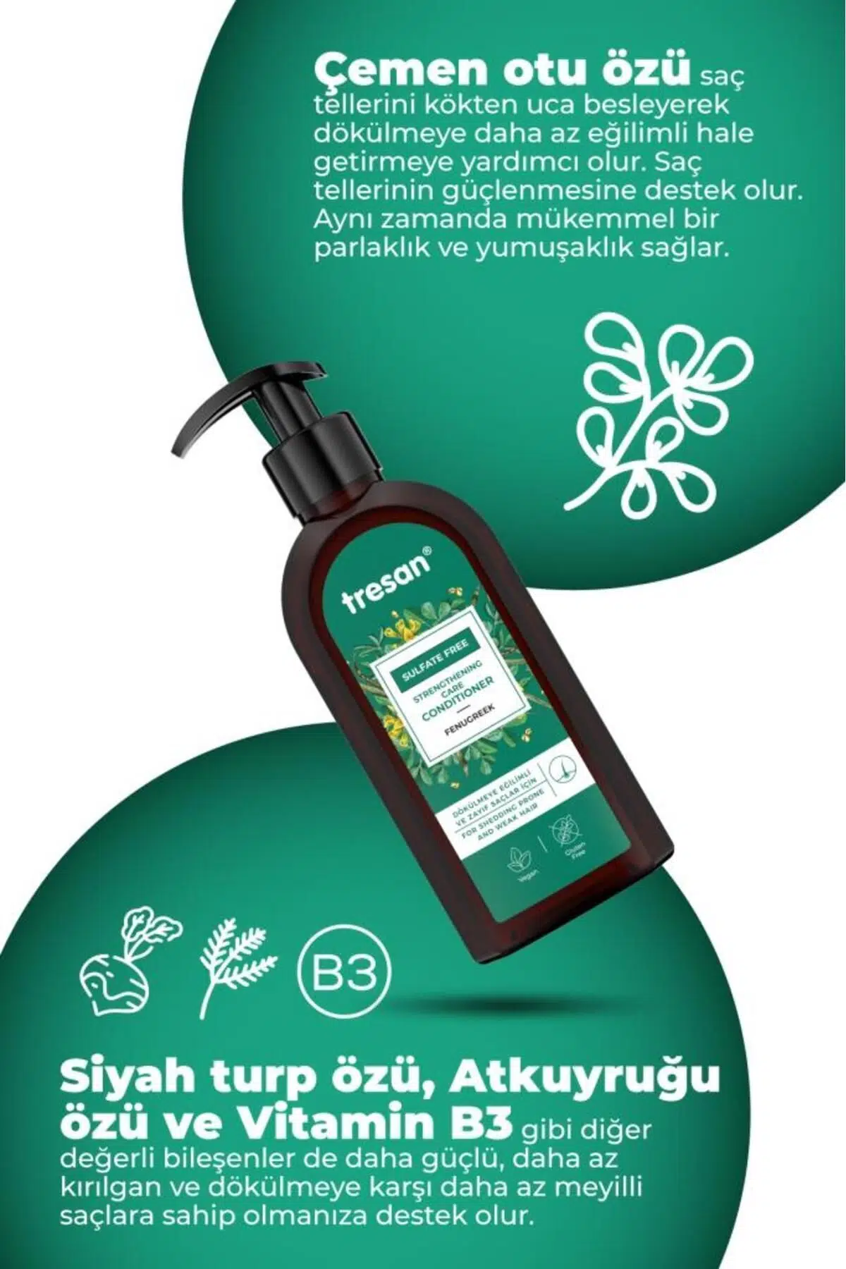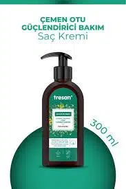 Tresan Çemen Otu Güçlendirici Bakım Saç Kremi, saç tellerini besleyip güçlendirerek dökülmeye karşı direnç sağlar. Parlaklık ve yumuşaklık kazandırır, saç yapısını korur. Siyah turp özü, Atkuyruğu özü ve Vitamin B3 ile saçları daha güçlü ve dökülmeye karşı dirençli yapar. Saçların daha kolay şekillenmesine ve taranmasına yardımcı olur. Kullanım: Şampuan ile yıkama sonrasında saç boy ve uçlarına uygulayın. Günlük kullanıma uygundur. Daha etkili sonuç için; Tresan Çemen Otu Güçlendirici Bakım Şampuanı ile birlikte kullanılması tavsiye edilir.