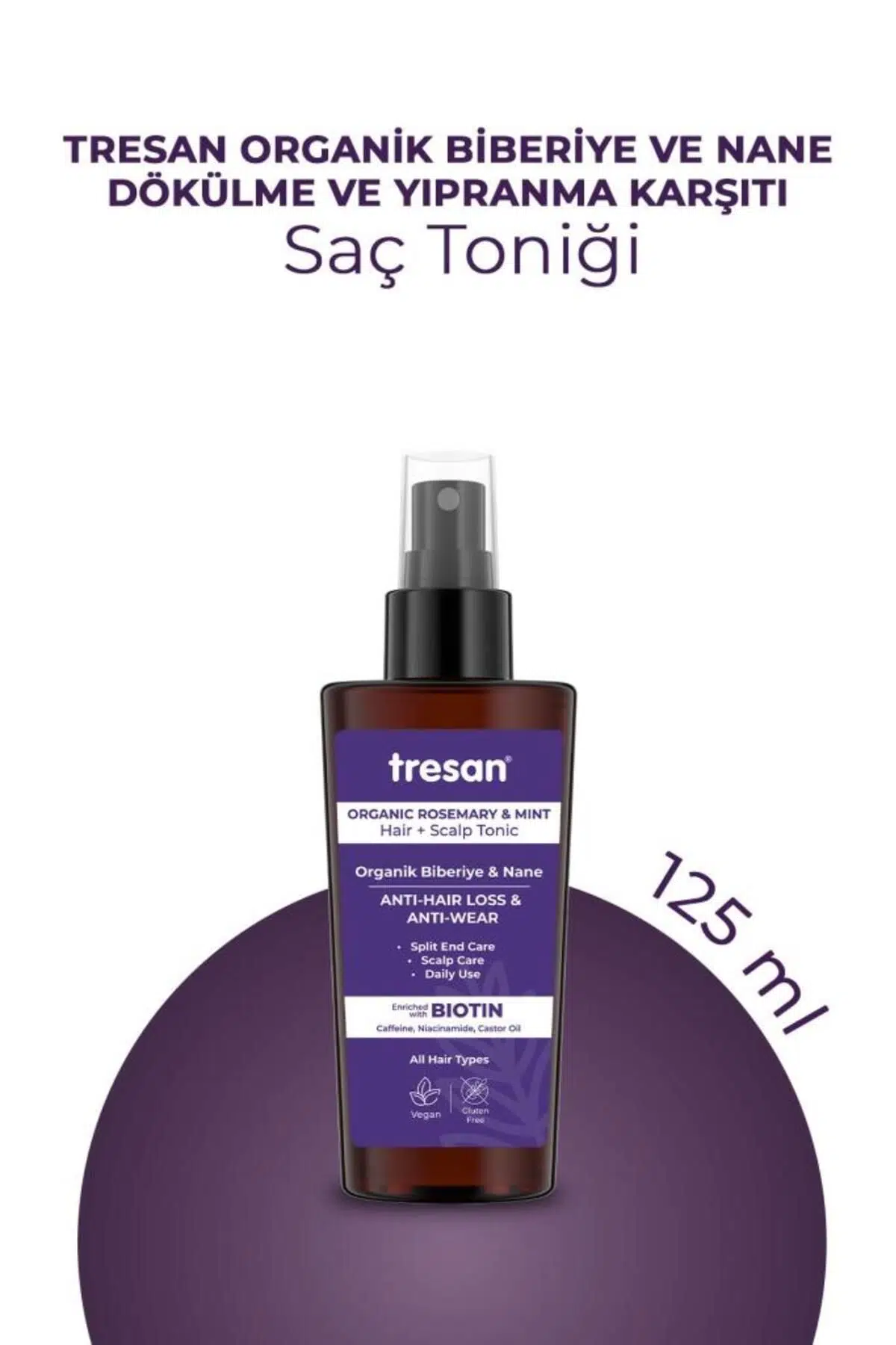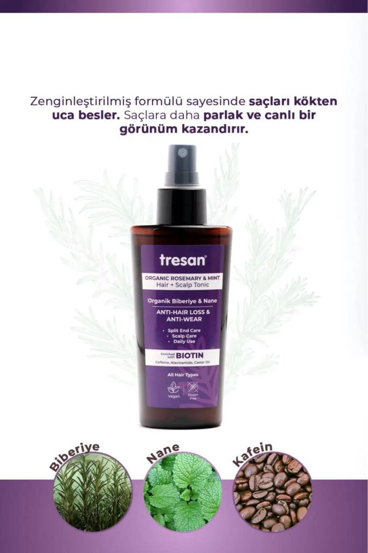 Tresan Biberiye & Nane Saç Toniği biberiye, nane, kafein, niacinamide, hint yağı, pantenol ve biotin ile zenginleştirilmiş formülü sayesinde saçların kökten uca beslenmesine yardımcı olur. Aynı zamanda saçların yıpranmaya karşı korunmasında ve nem dengesinin sağlanmasına yardımcı olarak saçların daha canlı ve parlak görünmesine destek olur. Saçlara kazandırdığı nem desteği sayesinde kolay tarama sağlar. Biberiye, kafein ve biotin içeriği ayrıca saç dökülmesinin en aza indirilmesine de yardımcı olur. Kullanım: Saç dip ve uçlarına masaj yaparak uygulanır. Islak veya kuru saça uygulanabilir. Durulama gerektirmez. Uygulamadan önce çalkalayınız. Daha etkili sonuç için; Tresan Biberiye Serisinin diğer ürünleri ile birlikte kullanılması tavsiye edilir. Günlük kullanım için uygundur. Çocukların ulaşamayacağı yerde, direkt gün ışığından uzak ve orijinal ambalajında saklayınız. Göz ile temasından kaçınınız.